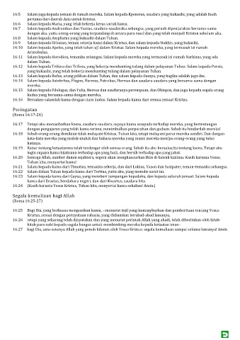 16:15 Salam kepada Filologus, dan Yulia, Nereus dan saudaranya perempuan, dan Olimpas, dan juga kepada segala orang