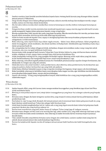 8:6 Sebab itu kami mendesak kepada Titus, supaya ia mengunjungi kamu dan menyelesaikan pelayanan kasih itu