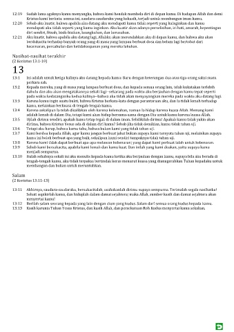 13:13 Kasih karunia Tuhan Yesus Kristus, dan kasih Allah, dan persekutuan Roh Kudus menyertai kamu sekalian.