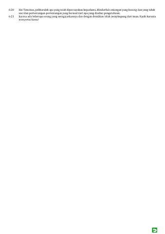 6:20 Hai Timotius, peliharalah apa yang telah dipercayakan kepadamu. Hindarilah omongan yang kosong dan yang tidak