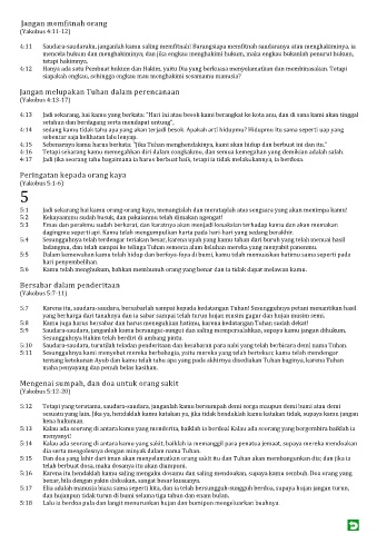 4:11 Saudara-saudaraku, janganlah kamu saling memfitnah! Barangsiapa memfitnah saudaranya atau menghakiminya, ia