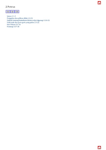 2 Petrus Salam 1:1-2 Panggilan dan pilihan Allah 1:3-15 Nubuat tentang kemuliaan Kristus telah digenapi 1:16-21 Nabi-nabi dan guru-guru yang palsu 2:1-22 Hari Tuhan 3:1-16 Penutup 3:17-18