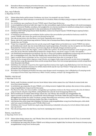 15:31 Selebihnya dari riwayat Nadab dan segala yang dilakukannya, bukankah semuanya itu tertulis dalam kitab sejarah