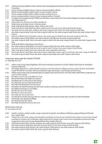 6:48 Saudara-saudara sesuku mereka, orang-orang Lewi yang lain, diserahkan melakukan segala pekerjaan di Kemah