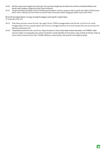 36:23 "Beginilah perintah Koresh, raja Persia: Segala kerajaan di bumi telah dikaruniakan kepadaku oleh TUHAN, Allah