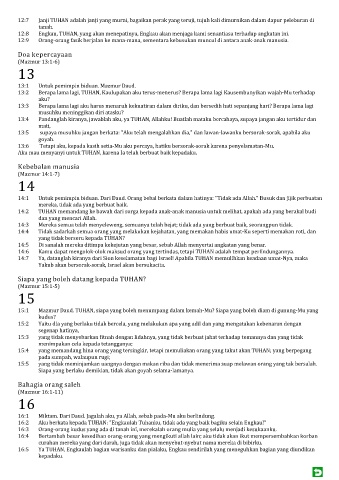 13:2 Berapa lama lagi, TUHAN, Kaulupakan aku terus-menerus? Berapa lama lagi Kausembunyikan wajah-Mu terhadap