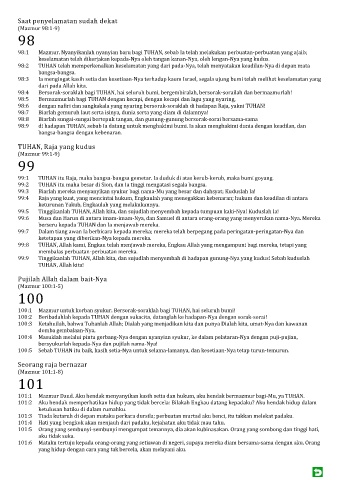 98:9 di hadapan TUHAN, sebab Ia datang untuk menghakimi bumi. Ia akan menghakimi dunia dengan keadilan, dan