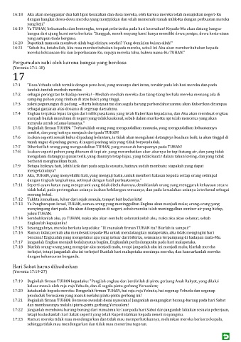 17:22 Janganlah membawa barang-barang dari rumahmu ke luar pada hari Sabat dan janganlah lakukan sesuatu pekerjaan,