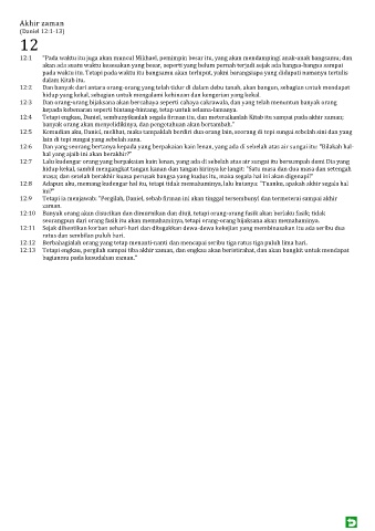 12:10 Banyak orang akan disucikan dan dimurnikan dan diuji, tetapi orang-orang fasik akan berlaku fasik; tidak