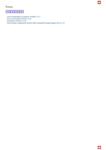 Yunus Yunus mengingkari panggilan TUHAN 1:1-17 Doa ucapan syukur Yunus 2:1-10 Pertobatan Niniwe 3:1-10 Yunus belajar menginsyafi, bahwa Allah mengasihi bangsa-bangsa lain 4:1-11