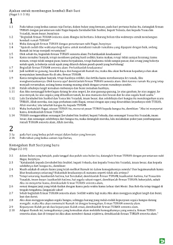 1:1 Pada tahun yang kedua zaman raja Darius, dalam bulan yang keenam, pada hari pertama bulan itu, datanglah firman