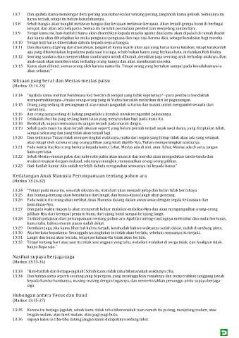 13:21 Pada waktu itu jika orang berkata kepada kamu: Lihat, Mesias ada di sini, atau: Lihat, Mesias ada di sana, jangan