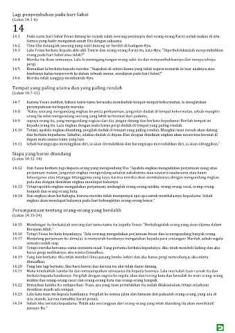 14:15 Mendengar itu berkatalah seorang dari tamu-tamu itu kepada Yesus: "Berbahagialah orang yang akan dijamu dalam