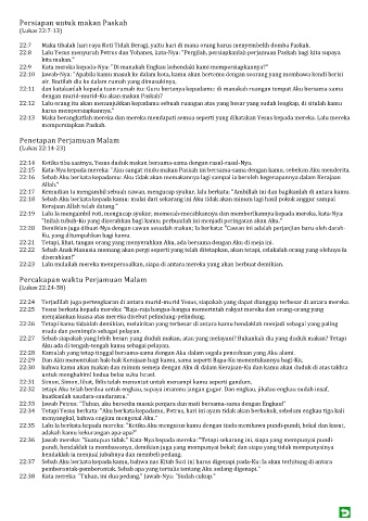 22:13 Maka berangkatlah mereka dan mereka mendapati semua seperti yang dikatakan Yesus kepada mereka. Lalu mereka