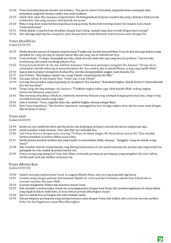 23:32 Dan ada juga digiring dua orang lain, yaitu dua penjahat untuk dihukum mati bersama-sama dengan Dia.