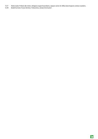5:27 Demi nama Tuhan aku minta dengan sangat kepadamu, supaya surat ini dibacakan kepada semua saudara. 5:28 Kasih karunia Yesus Kristus, Tuhan kita, menyertai kamu!