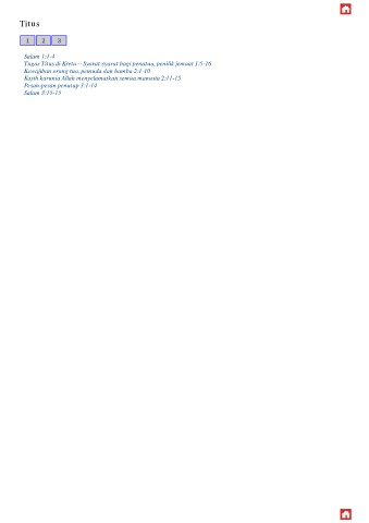 Titus Salam 1:1-4 Tugas Titus di Kreta -- Syarat-syarat bagi penatua, penilik jemaat 1:5-16 Kewajiban orang tua, pemuda dan hamba 2:1-10 Kasih karunia Allah menyelamatkan semua manusia 2:11-15 Pesan-pesan penutup 3:1-14 Salam 3:15-15