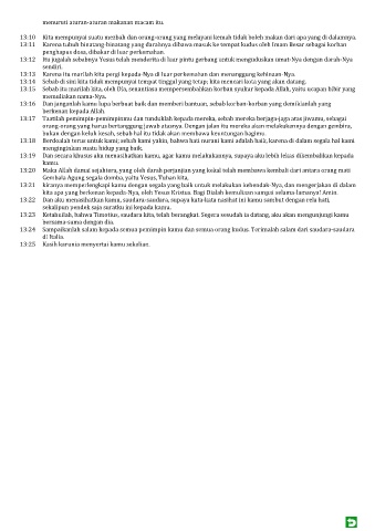 13:16 Dan janganlah kamu lupa berbuat baik dan memberi bantuan, sebab korban-korban yang demikianlah yang
