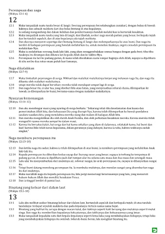 12:15 Lalu ular itu menyemburkan dari mulutnya air, sebesar sungai, ke arah perempuan itu, supaya ia dihanyutkan sungai