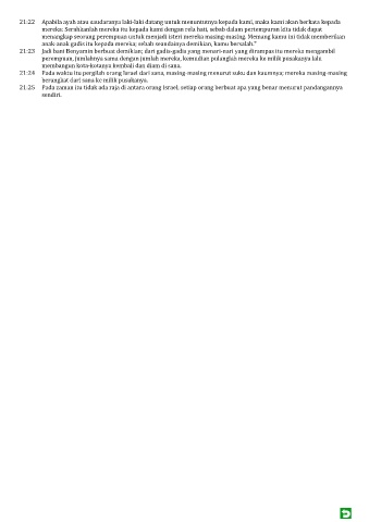 21:25 Pada zaman itu tidak ada raja di antara orang Israel; setiap orang berbuat apa yang benar menurut pandangannya