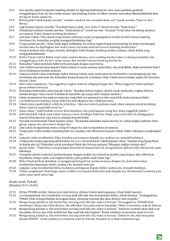 29:30 Yakub menghampiri Rahel juga, malah ia lebih cinta kepada Rahel dari pada kepada Lea. Demikianlah ia bekerja pula