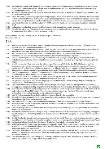 18:29 Maka makin takutlah Saul kepada Daud. Saul tetap menjadi musuh Daud seumur hidupnya.