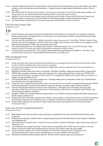 16:3 Kemudian bertanyalah raja: "Di manakah anak tuanmu?" Jawab Ziba kepada raja: "Ia ada di Yerusalem, sebab