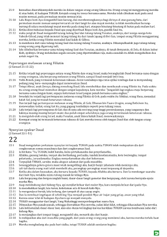 21:22 Keempat orang ini termasuk keturunan raksasa di Gat; mereka tewas oleh tangan Daud dan oleh tangan orang-