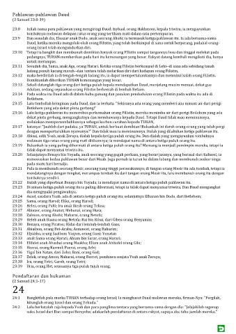 23:15 Lalu timbullah keinginan pada Daud, dan ia berkata: "Sekiranya ada orang yang memberi aku minum air dari perigi
