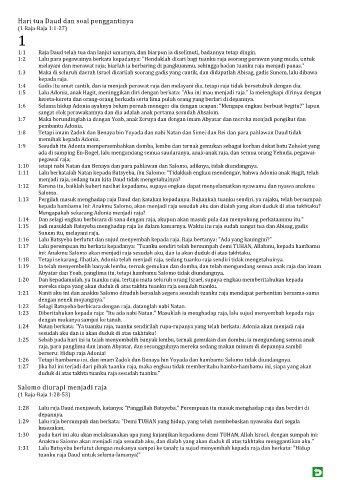 1:5 Lalu Adonia, anak Hagit, meninggikan diri dengan berkata: "Aku ini mau menjadi raja." Ia melengkapi dirinya dengan
