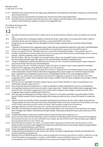 11:41 Selebihnya dari riwayat Salomo dan segala yang dilakukannya dan hikmatnya, bukankah semuanya itu tertulis dalam