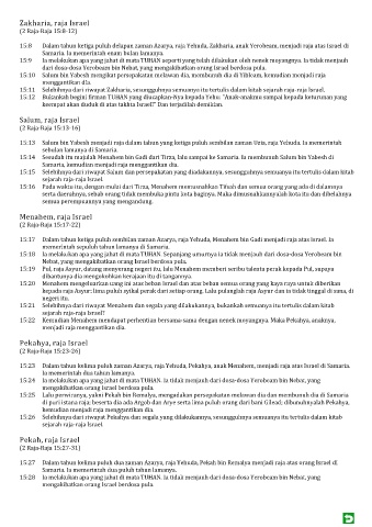15:11 Selebihnya dari riwayat Zakharia, sesungguhnya semuanya itu tertulis dalam kitab sejarah raja-raja Israel.