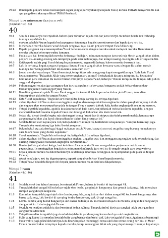 40:16 Setelah dilihat oleh kepala juru roti, betapa baik arti mimpi itu, berkatalah ia kepadanya: "Akupun bermimpi juga.