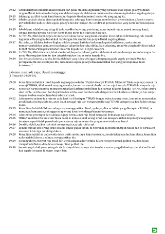 29:24 Lalu semua pemimpin dan pahlawan, juga semua anak raja Daud mengakui kekuasaan raja Salomo.