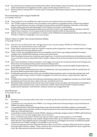 32:32 Selebihnya dari riwayat Hizkia dan perbuatan-perbuatannya yang setia, sesungguhnya semuanya itu tertulis dalam