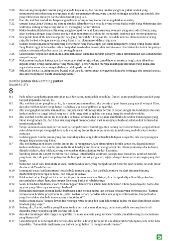 8:14 Maka ia menjawab: "Sampai lewat dua ribu tiga ratus petang dan pagi, lalu tempat kudus itu akan dipulihkan dalam