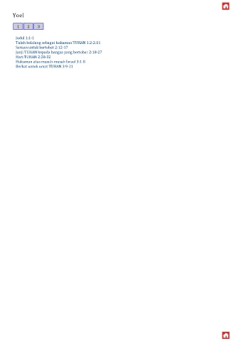 Yoel Judul 1:1-1 Tulah belalang sebagai hukuman TUHAN 1:2-2:11 Seruan untuk bertobat 2:12-17 Janji TUHAN kepada bangsa yang bertobat 2:18-27 Hari TUHAN 2:28-32 Hukuman atas musuh-musuh Israel 3:1-8 Berkat untuk umat TUHAN 3:9-21