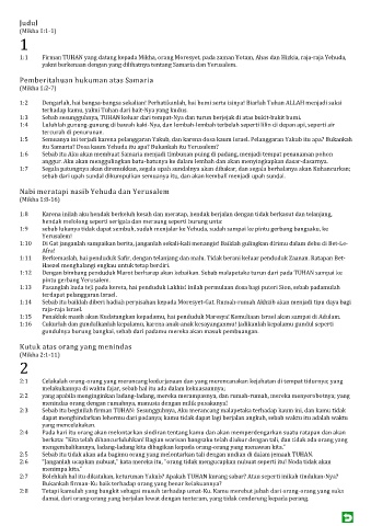1:1 Firman TUHAN yang datang kepada Mikha, orang Moresyet, pada zaman Yotam, Ahas dan Hizkia, raja-raja Yehuda,