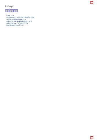 Zefanya Judul 1:1-1 Penghukuman pada hari TUHAN 1:2-18 Seruan untuk bertobat 2:1-3 Hukuman atas bangsa-bangsa 2:4-15 Hukuman atas Yerusalem 3:1-8 Janji keselamatan 3:9-20