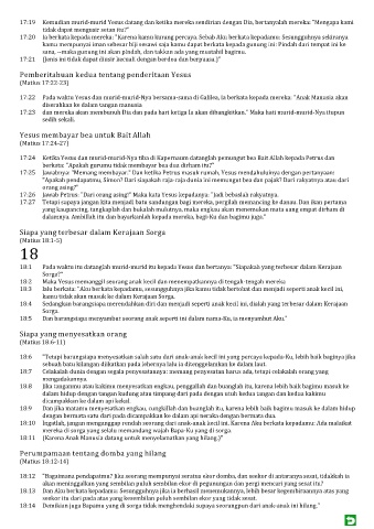 17:23 dan mereka akan membunuh Dia dan pada hari ketiga Ia akan dibangkitkan." Maka hati murid-murid-Nya itupun