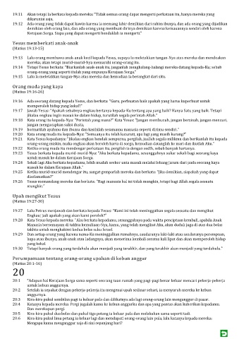 19:24 Sekali lagi Aku berkata kepadamu, lebih mudah seekor unta masuk melalui lobang jarum dari pada seorang kaya