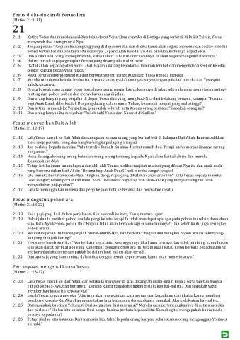 21:13 dan berkata kepada mereka: "Ada tertulis: Rumah-Ku akan disebut rumah doa. Tetapi kamu menjadikannya sarang