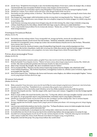 26:24 Anak Manusia memang akan pergi sesuai dengan yang ada tertulis tentang Dia, akan tetapi celakalah orang yang