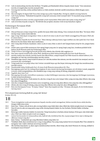 17:20 Atas pertanyaan orang-orang Farisi, apabila Kerajaan Allah akan datang, Yesus menjawab, kata-Nya: "Kerajaan Allah