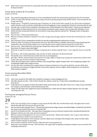 20:1 Pada suatu hari ketika Yesus mengajar orang banyak di Bait Allah dan memberitakan Injil, datanglah imam-imam